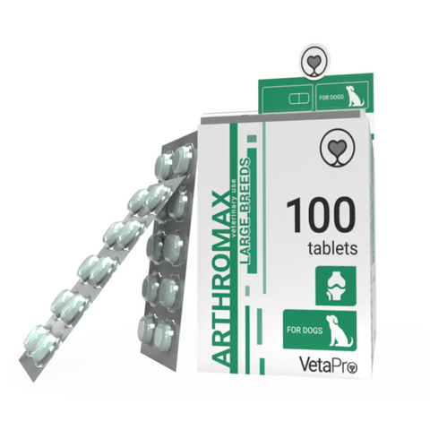Arthromax Large Breeds pašaro papildas, specialiai sukurtas didelių veislių šunims. Jis maitina ir skatina sąnarių kremzlių vystymąsi, padeda augintiniams išlaikyti normalų judėjimą ir mobilumą. Galima naudoti jauniems gyvūnams, turintiems augimo problemų, ir gyvūnams, sergantiems osteoartritu.