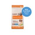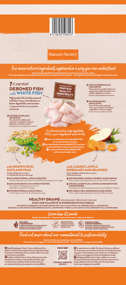 Sudėtis: Iškaulinta balta žuvis* (menkė ir kitos sezoninės žuvys) (16%), džiovinti žirniai* (15%), avižos* (13%), kukurūzų baltymai, džiovinti tuno baltymai (10%), rudieji ryžiai* (7%), visos miežių dalys*, paukštienos riebalai* (6%), hidrolizuoti gyvūniniai baltymai (paukštiena, kiauliena, žuvis) (4%), runkelių minkštimas*, mineralai, džiovintos morkos* (0,5% atitinka 4% šviežių morkų), džiovinti obuoliai (0,3% atitinka 2% šviežių obuolių), džiovinti dumbliai (rudadumbliai)* (0,01%), džiovintas rozmarinas* (0,01%). *Natūralūs ingredientai.