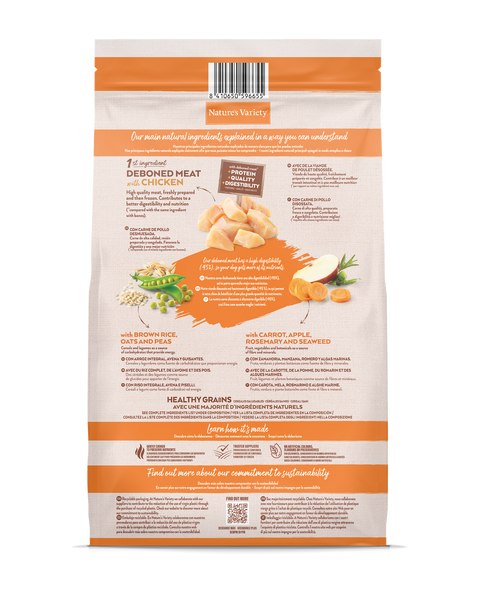 Sudėtis: Iškaulinta vištiena* (20%), džiovinti vištienos baltymai (18%), džiovinti žirniai* (15%), kukurūzų baltymai, rudieji ryžiai* (7%), paukštienos riebalai* (6,5%), visos miežių dalys *, hidrolizuoti gyvūniniai baltymai (paukštiena, kiauliena, žuvis) (4%), mineralai, žuvų taukai* (1%), džiovintos morkos* (0.5% atitinka 4% šviežių morkų), džiovinti obuoliai* (0.3% atitinka 2% šviežių obuolių),džiovinti jūros dumbliai (rudadumbliai)*, (0,01%), džiovinti rozmarinai* (0,01%). *Natūralūs ingredientai.
