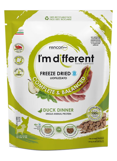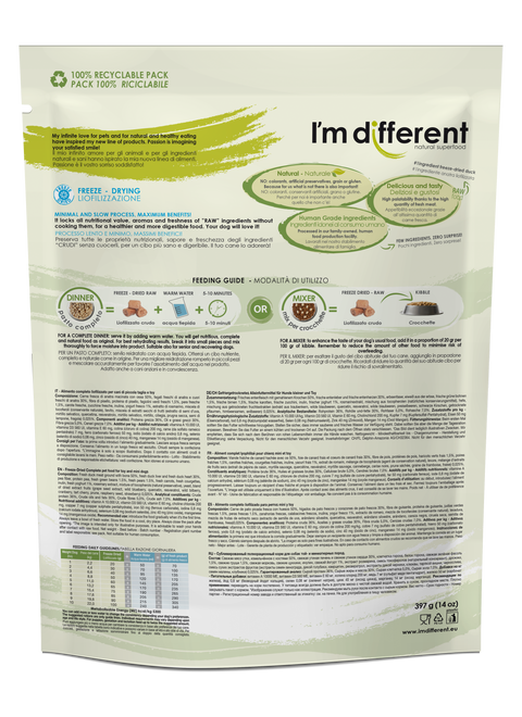 Visavertis šunų maistas, I'm Different Complete Food liofilizuotas šunų pašaras yra puiki raw mitybos alternatyva. Liofilizuoti pašarai šunims imituoja po protėvių mitybą.