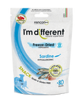 Sudėtis: Šviežios sardinės 95%, cikorijų inulinas (Frukto-oligosacharidų FOS šaltinis min 2%), daržovių aromatai, rozmarinų ekstraktas, tokoferolių mišinys (natūralus konservantas), mielės, džiovintų vaisių ekstrakto mišinys (vynuogių kauliukų ekstraktas, miško mėlynės, kvercetinas, resveratrolis, mėlynės, spanguolės, vyšnių koncentratas, džiovintos slyvos, aviečių sėklos, braškės) 0,025%.
