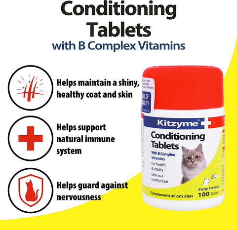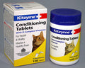 Savybės ir paskirtis. „Kitzyme“ yra natūralus alaus mielių produktas , kurio sudėtyje esantys vitaminai ir mineralai yra svarbūs katės sveikatai ir gerai fizinei būklei palikyti. Gardžiose tabletėse yra natūralus B vitaminų kompleksas. B grupės vitaminai turi būti gaunami kasdien, nes jie yra tirpūs vandenyje ir negali kauptis organizme. „Kitzyme“ padeda palaikyti sveiką apetitą, išsaugoti sveiką odą ir blizgantį kailį, padeda saugoti nuo nervingumo. Papildas idealiai tinka augantiems kačiukams, padeda palaikyti gerą sveikatą suaugusioms katėms, tinka katingoms katėms. Tabletės gali būti naudojamos kaip skanėstai. Naudojimas ir dozės. Duodama katėms pagal svorį vieną kartą dienoje. Kačiukams - 0,5 - 6 tbl., suaugusioms katėms 3 - 6 tbl., katingoms katėms - 6 tbl.