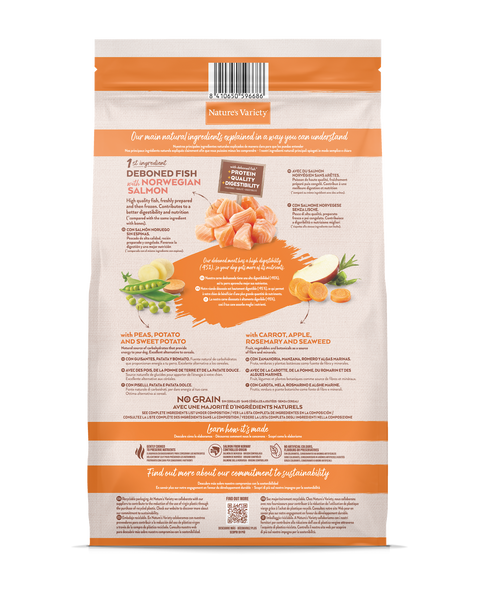 Sudėtis: Iškaulinta norvegiška lašiša* (20%), džiovinti tuno baltymai (18%), džiovinti žirniai* (15%), džiovintos bulvės* (8%), paukštienos riebalai* (7%), saldžios bulvės* (4%), hidrolizuoti gyvūniniai baltymai (paukštiena, kiauliena, žuvis) (4%), žirnių krakmolas* runkelių minkštimas* žirnių krakmolas*,, mineralai, džiovintos morkos* (0,5% atitinka 4% šviežių morkų) atitinka 4% šviežių morkų), džiovinti obuoliai* (0,3% atitinka 2% šviežių obuolių), džiovinti jūros dumbliai (rudadumbliai)* (0,01%), džiovintas rozmarinas* (0,01%). *Natūralūs ingredientai